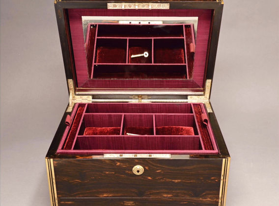 Victorian coromandel brass bound jewellery box with push button drawer, removable tray and mirror.